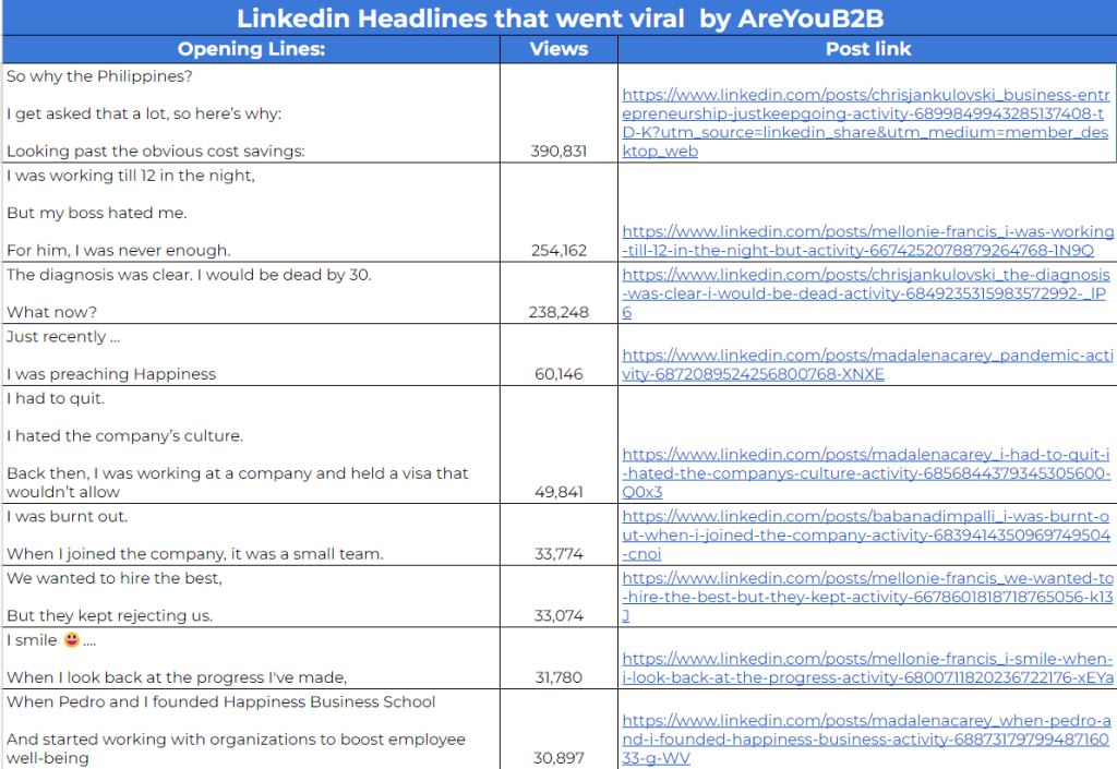 SWIPE FILE 50+ Viral LinkedIn Opening Lines Here are our best LinkedIn Opening lines to help you on your content journey. Please enable JavaScript in your browser to complete this form.Name *FirstLastEmail *Company Name *Get 50+ Viral LinkedIn Opening Lines The Agency for All Your LinkedIn Marketing Needs TALK TO STRATEGIST